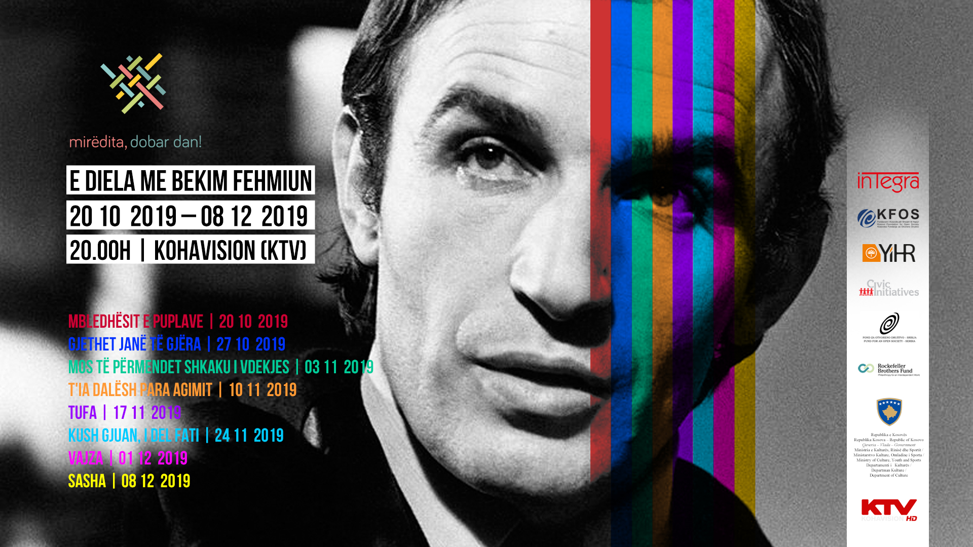 Ky aktivitet i dizajnuar për një publikë të gjerë, për dy muaj rresht, çdo të diele në KTV, prej orës 20:00, do të shfaqë gjithsej 8 filma në të cilët paraqitet aktori i fashmshëm Bekim Fehmiu. Kjo seri e filmave të aktorit Bekim Fehmiu do të nisë me datë 20.10.2019 për të vazhduar deri më 08.12.2019. Ky aktivitet synon që përmes transmetimit të filmave të Bekim Fehmiut në KTV të arrijë një numër të madh të audiencës së re, të cilët nuk kanë pasur mundësi t’i shohin filmat e Bekim Fehmiu. Çdo e diel mbrëma, në këtë periudhë të caktuar, do të jetë e rezervuar vetëm për Bekim Fehmiun.