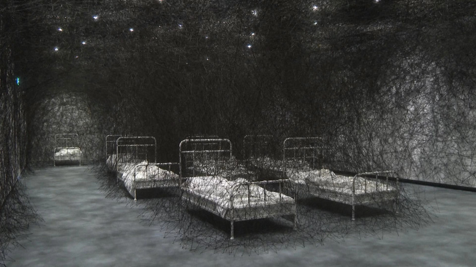 Në anën tjetër, mijëra metra fijesh të zeza mbulojnë radhë shtretërish në veprën e titulluar “During Sleep”. Për këtë instalacion, Chiharu Shiota, u frymëzua nga përvoja e saj e ndërrimit të banesës nëntë herë brenda tre vjetësh, kur u shpërngul për herë të parë në Gjermani.