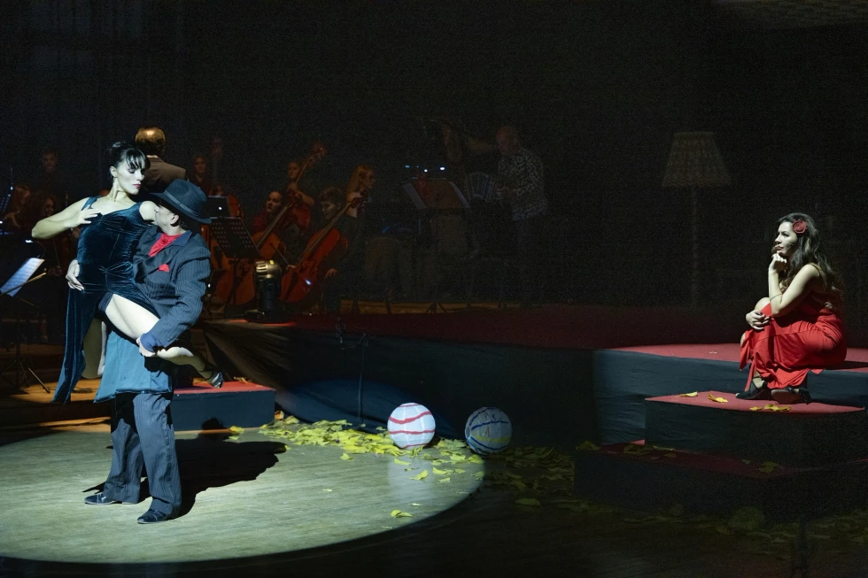 Tingëllima hispanike është përjetuar nga afër në skenën e improvizuar, e cila ka sjellë për herë të parë një operë të këtillë të pazakontë. Kori dhe Orkestra e Operës së Kosovës, drejtuar nga dirigjenti Kushtrim Gashi, kanë sjellë tingujt melodikë të operës, të harmonizuar me bandoneon, instrumentin që ndërthur traditën operistike me ngjyrimet ritmike dhe nostalgjike të tangos.