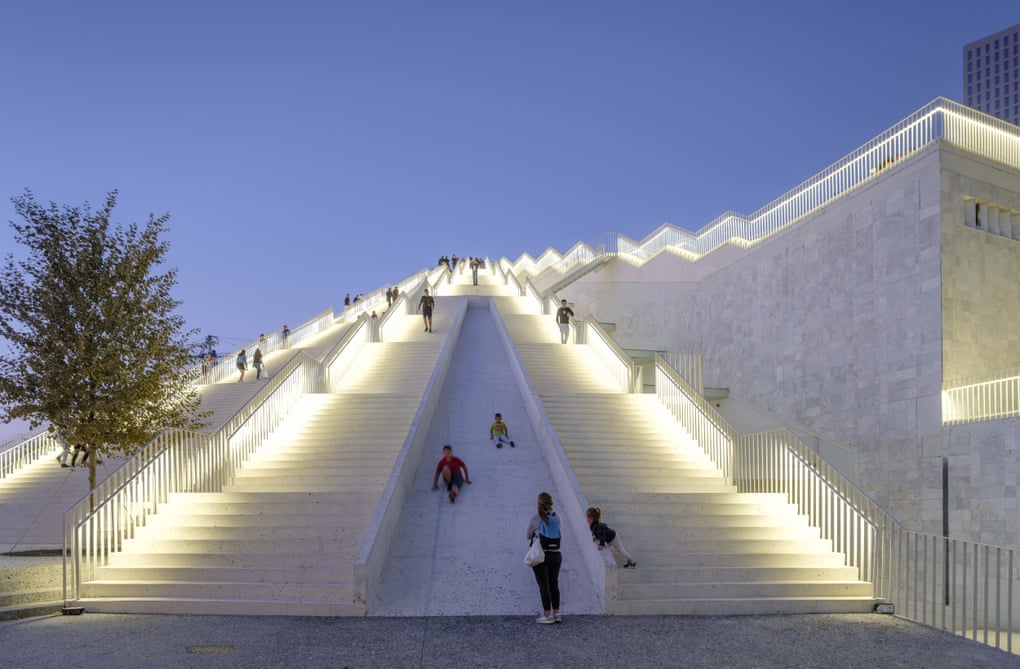 Hapësirat e reja janë të vendosura si 34 kuti shumëngjyrëshe të shpërndara brenda, mbi dhe rreth strukturës së vjetër si lego të një fëmije të pakujdesshëm, të projektuara nga qasja arkitekturore holandeze MVRDV. Shkallë ngjiten në pjesën e jashtme të çatisë, me një pjesë të mbajtur ende për rrëshqitje, në mënyrë që njerëzit të mund të ngjiten më sigurt se më parë. Puna e re, thotë një nga partnerët themelues të MVRDV, Winy Maas, “kapërcen” Piramidën, është një anarki e menaxhuar tashmë.