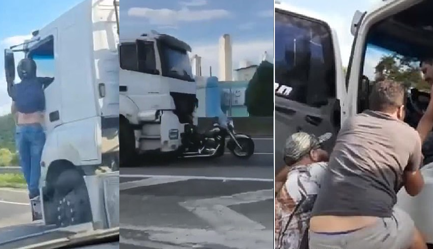 Këto janë momentet e rënda kur një motoçiklist u kap në anë të një kamioni që vazhdoi rrugën pasi e goditi duke i vrarë gruan, në një autostradë në jug të Brazilit.