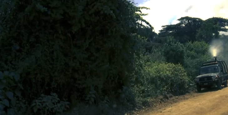 Karvanët e kamionëve të pajisur me makina spërkatëse drejtohen nëpër fusha nga ushtarët, të mbështetur nga shërbimi kombëtar i të rinjve.
