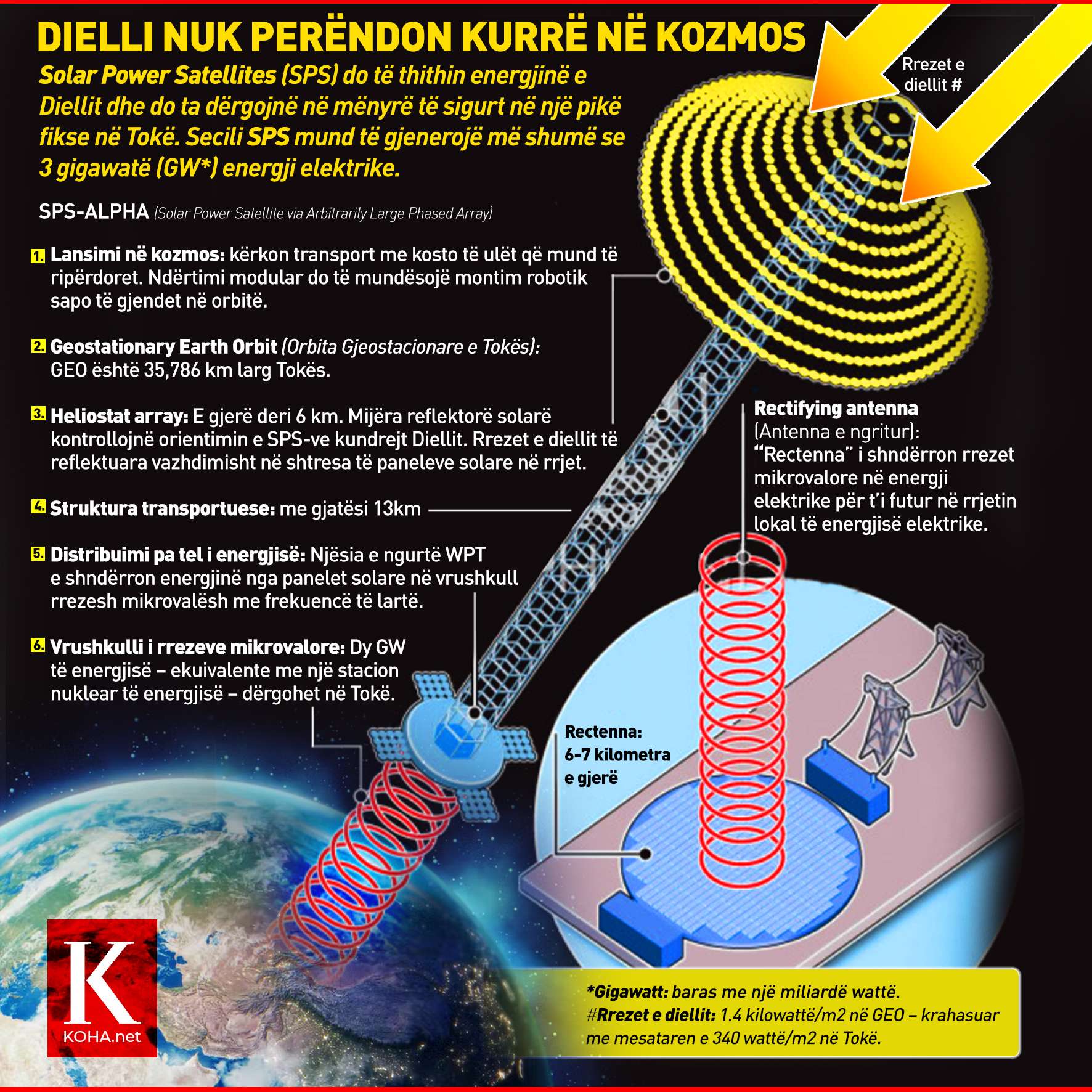 Solar Power Satellites (SPS) do të thithin energjinë e diellit dhe do ta dërgojnë në mënyrë të sigurt në një pikë fikse në tokë. Secili SPS mund të gjenerojë më shumë se 3 gigavatë (GW) energji elektrike.