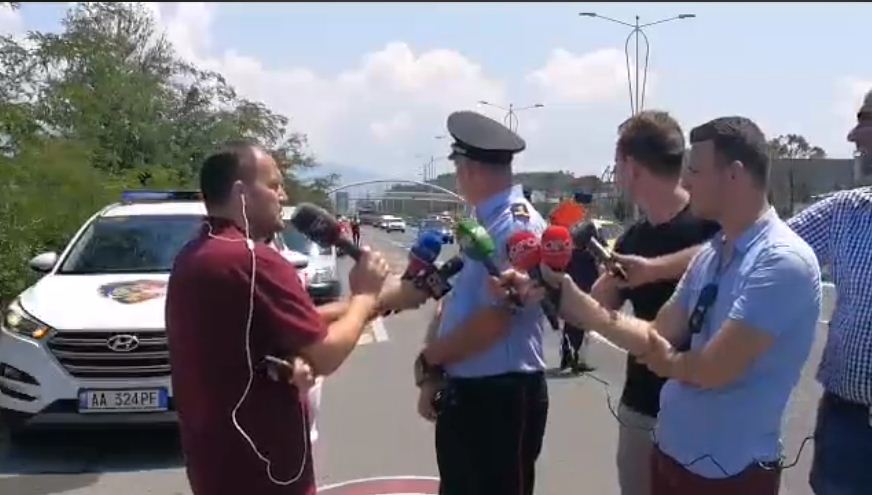 Drejtori i Përgjithshëm i Policisë Rrugore, Mitat Tola po jepte një intervistë për gazetarët lidhur me sigurinë rrugore kur pas krahëve të tij ndodh aksidenti.