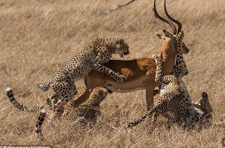 Fotot tregojnë nënën gepard Selenkei, që sulmon fillimisht impalën 70 kilogramëshe teksa më pas asaj i bashkohet katër të rinjtë e saj, që megjithëse pa sukses supozohet të kenë fituar eksperiencë për gjueti të ardhshme./tch