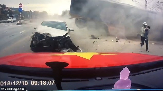 Në videon e incizuar përmes kamerës së një veture, shihet një grua në Vietnam që vrapon pasi vëren se kamioni kishte humbur kontrollin dhe po shkonte në drejtim të veturës së saj.