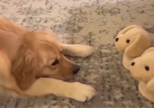 This sweet pup is a little confused by these puppy-like slippers! ?