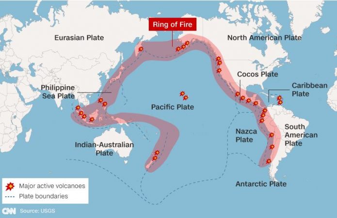 Është pikërisht kjo zona ku ndodhin 90 për qind e tërmeteve në botë dhe 81 për qind e vullkaneve. Prania e një rripi të aktivitetit vullkanik që rrethon Oqeanin Paqësor është vërejtur në shekullin e 19-të. Ishujt Japonezë janë në linjën e këtij rrethi të madh të zhvillimit vullkanik që rrethon brigjet e Paqësorit nga Tierra del Fuego përreth Moluccas.
