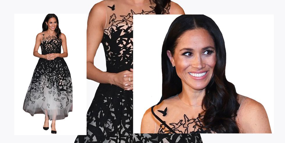 Markle kishte veshur fustan nga marka “Oscar de la Renta, e që po e përcillte burri i saj, princi Harry.