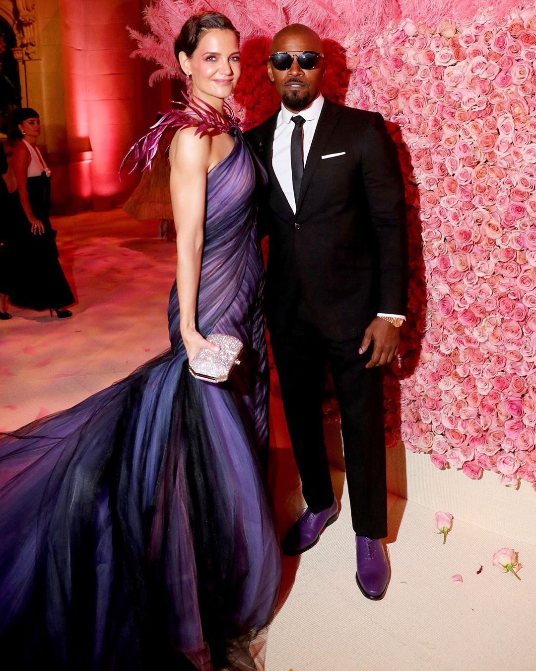 I përzgjedhuri i saj, 51-vjeçari Jamie Foxx, për këtë rast kishte zgjedhur një kostum klasik të zi, këmishë të bardhë dhe kravatë të zezë, por megjithatë i përshtati rrobat me Katie duke zgjedhur këpucë ngjyrë vjollce.