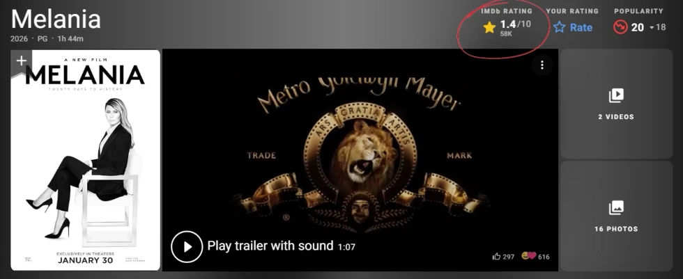 Projekti filmik, me titull “Melania: 20 Days to History”, ka fituar mbi 7 milionë dollarë (rreth 5.1 milionë paund) në fundjavën e parë pas lansimit në kinematë amerikane, ani pse IMDb e ka notuar me notën 1.4.