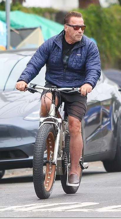 Ylli i “Terminator”, i cili mbushi 74 vjet të premten, dukej se po e shijonte shëtitjen me biçikletë teksa bisedonte me miqtë e tij dhe buzëqeshte, kur grupi po zbriste në një nga rrugët e qytetit.