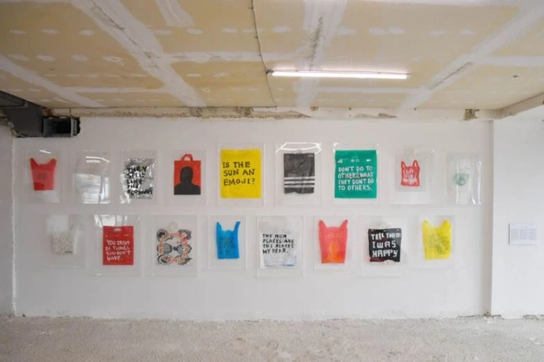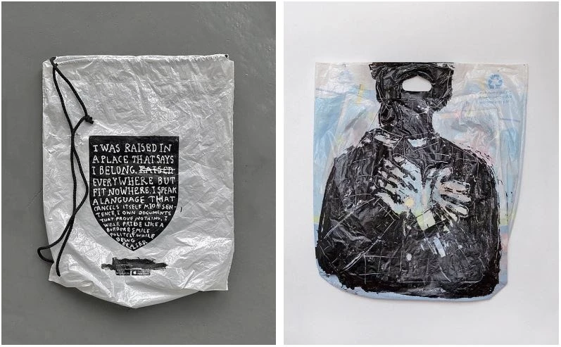 DS: Gjergj Kastrioti kishte deklaruar: “Unë nuk jua solla lirinë, atë e gjeta mes jush”. Gjithnjë e them të kundërtën: Unë nuk jua solla qeset, ato i gjeta mes jush! Ideja e blerjes së një pëlhure për të pikturuar mbi të më dukej absurde. Në vend të kësaj, në vitin 2018, iu drejtova objektit më të zakonshëm që gjendej rrugëve të Prishtinës: qesja plastike. E fiksova, e përvetësova, ia ngjita mendimet e mia dhe i lashë të fluturonin si një kafshë e egër, bijë e mizorisë sonë ndaj natyrës. Gjithmonë më ka tërhequr kufiri i brishtë mes asaj që konsiderohet e përshtatshme ose jo në art. Për mua, banaliteti është një vlerë në vetvete. Të punosh me të është njëkohësisht një kundërsulm ndaj asaj që nuk mund të shmanget, dhe një trashëgimi e heshtur: një marrëdhënie me të gatshmen, as e ndaluar, as e shkarkuar, por thjesht e pranishme, ngulmuese. Plastika, në këtë kuptim, është më shumë se material. Është mbetje e kohës sonë, fosili i së tashmes. Siç na kujton Bruno Latour, urgjenca planetare tregon se nuk jemi kurrë jashtë natyrës, por të ngatërruar thellë në vetë krizat që krijojmë. Të shkruash mbi një qese plastike do të thotë ta pranosh këtë ngatërrim, ku intimiteti dhe katastrofa ndajnë të njëjtën sipërfaqe të brishtë.