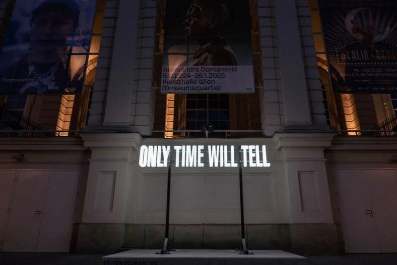 DS: “Only Time Will Tell” nuk është thjesht titulli i instalacionit; është një lloj profecie ironike e ngjitur në oborrin kryesor të MQ-së. Me shkronja të ndritshme, qëndron si një far i vjetër që na thërret të mos presim pasivisht, por të hyjmë në moment dhe të ndihmojmë të drejtimin e asaj që vjen. Në oborrin e MQ-së, koha bëhet një pasqyrë. Artistët nuk janë parashikues, megjithatë na kërkohet vazhdimisht të themi çfarë do të sjellë e ardhmja. Ky paradoks kalon në vetë veprën: ajo nuk parashikon, por reflekton. Oborri i MQ-së është i madh dhe ceremonial, një skenë ku kalojnë mijëra njerëz çdo ditë, megjithatë vepra ndihet personale, më shumë si një gur i hedhur në një pellg që krijon valë brenda dhe jo jashtë. Për mua, koha ka qenë gjithmonë një konstrukt i imagjinatës, jo një vijë e drejtë, por një cikël fragmentesh që mbajmë derisa ato të shpërbëhen. Kjo ide u pasqyrua bukur në këtë hapësirë publike. Vepra nuk është statike; ajo të kërkon të ndalosh, të reflektosh mbi atë që mbetet dhe atë që zhduket. E vendosur nga kuratorja Verena Kaspar-Eisert në një vend ku është e pamundur të mos e vëresh, fraza lëviz mbi kokën tënde derisa ecën në MQ, jo një punë që e kalon, por një që ecën me ty shumë pas largimit tënd.