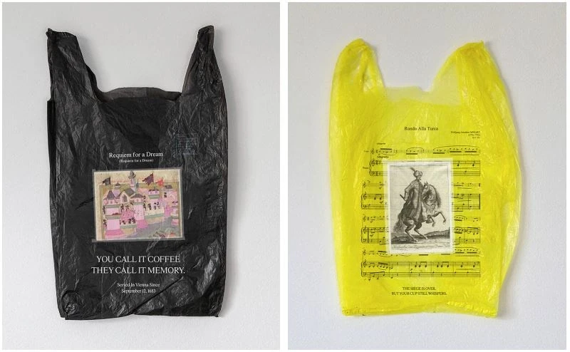 DS: Vendosja e veprave të mia më bën të ndihem i privilegjuar, sepse në fakt vij nga një botë e ngatërruar keq me politikën, ku estetika ka pak ose aspak vend, përveç asaj që do të ishte estetika e politikës. Po kthehem te koncepti kuratorial i Aleksei Barysionak: “Plastic bags deliver unexpected truths (Qeset plastike sjellin të vërteta të papritura)”. Unë nisa një hetim edhe më të thellë, duke bashkuar kujtesën, zhvendosjen dhe fuqinë; një përpjekje për të rizbuluar atë që është deformuar nga të gjitha anët që nga Rrethimi i Vjenës deri sot. “Requiem for a Dream” mbulon sipërfaqen e qeses plastike me shekuj mbetjesh historike: një miniaturë e pikturës së “Rrethimit”, një partiturë muzikore nga “Rondo alla Turca” e Mozartit, dhe ilustrime miniature të periudhës së kalorësisë osmane. Këto imazhe që duken si zbukurime trajtohen jo si dokumente historike, por si mbetje emocionale; elemente të gjurmëve të një momenti kulturor që ende përshkojnë psikikën bashkëkohore evropiane. Çdo qese mban fraza që lëndojnë po aq sa ngushëllojnë: “Ti e quan kafe. Ata e quajnë kujtim”, “Rrethimi ka përfunduar. Por filxhani yt ende pëshpërit”. Ato flasin për perandori jo me tregime madhështore, por me shije dhe mbetje akustike. Në Vjenë, ku kafeteritë romantizohen si djepa të mendimit modern, origjina osmane e kafesë përmendet rrallë. Këtu, unë ndryshoj filtrin: ajo që mbërrin në filxhanin prej porcelani nuk është vetëm kafe, por një histori pushtimi, ekzili dhe mimikrie. Atë që Mozarti e shndërroi në një zbukurim lojërash me “Alla Turcan” e tij, unë e rikthej me ironi dhe dhimbje.