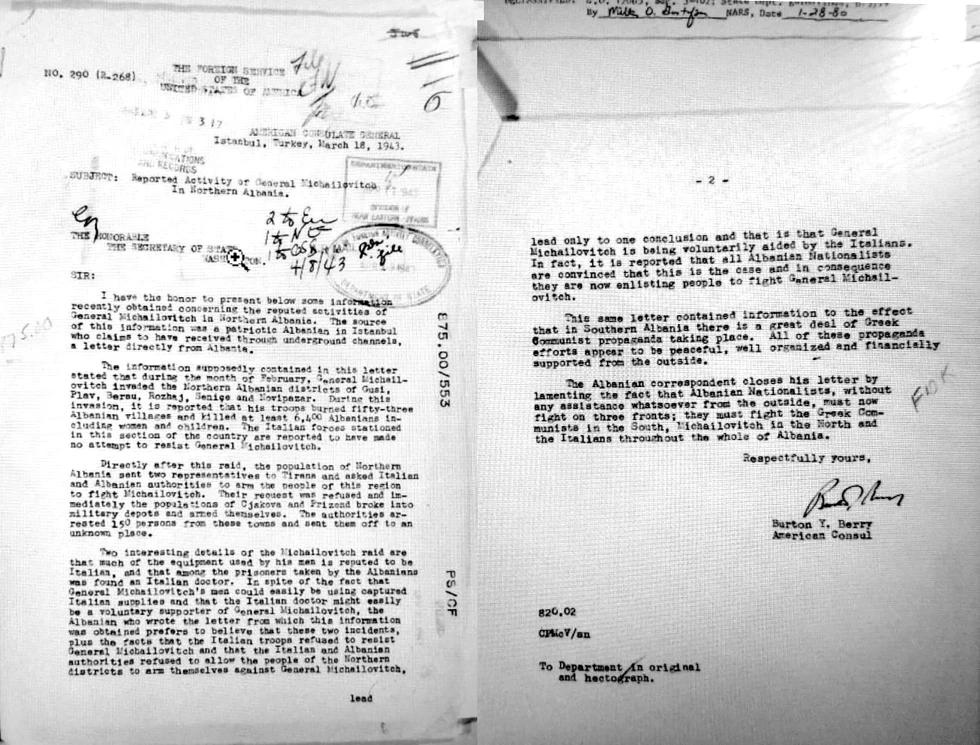 “...gjatë muajit shkurt, Gjenerali Mihajlloviq pushtoi rrethet veriore shqiptare të Gucisë, Plavës, Beranit*, Rozhajës, Senicës dhe Pazarit të Ri (Novi Pazar). Gjatë këtij pushtimi, raportohet se trupat e tij dogjën pesëdhjetë e tri fshatra shqiptare dhe vranë të paktën 6 mijë e 400 shqiptarë, përfshirë gra dhe fëmijë. Forcat italiane të stacionuara në këtë pjesë të vendit raportohet se nuk kanë bërë asnjë përpjekje për t’i rezistuar Gjeneralit Mihajlloviq”, shkruhet në raportin diplomatik nga Konsullata e Përgjithshme e Shteteve të Bashkuara të Amerikës në vitin 1943