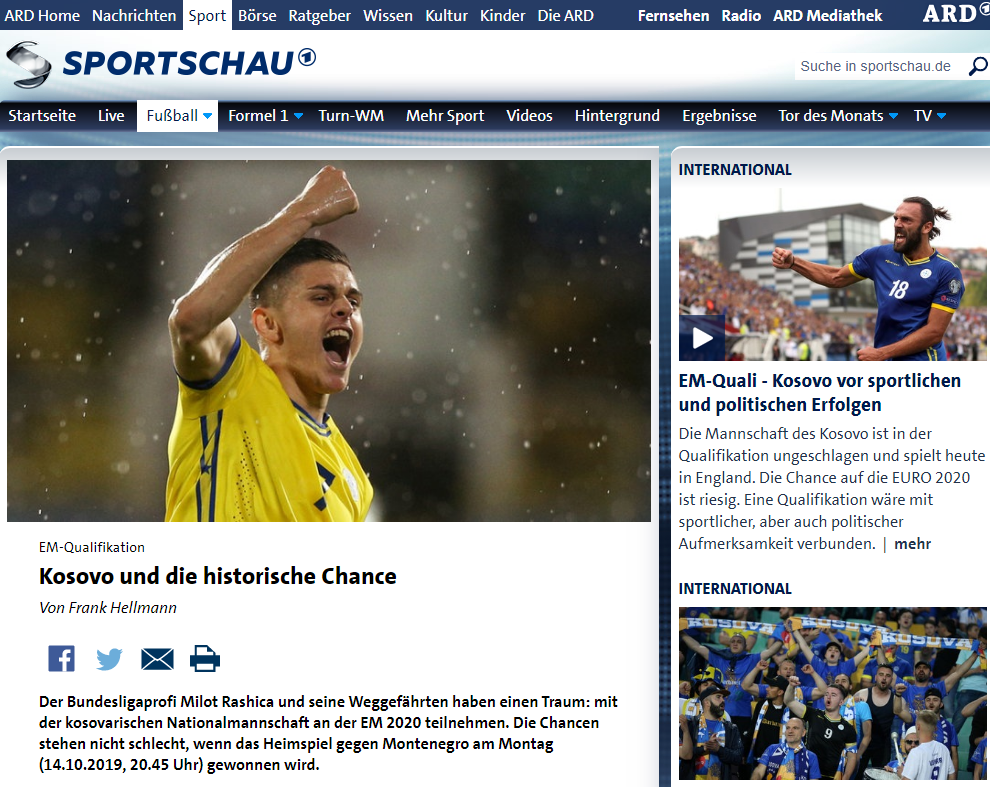 “Por edhe nëse shkon keq për Kosovën ‘shpresëvogël’, ëndrra vazhdon, pasi kombëtarja e këtij vendi të vogël, ka fituar grupin e vet, në grupin D të Ligës së Kombeve dhe në mars të vitit të ardhshëm, mund ta sigurojë biletën për Evropian, në ndeshjet e Play-Offit”. ARD-ja vazhdon të flasë për Rashicën që më 15 golat në vitin 2019 dhe formën e mirë, mund të kalojë te ndonjë skuadër e madhe.