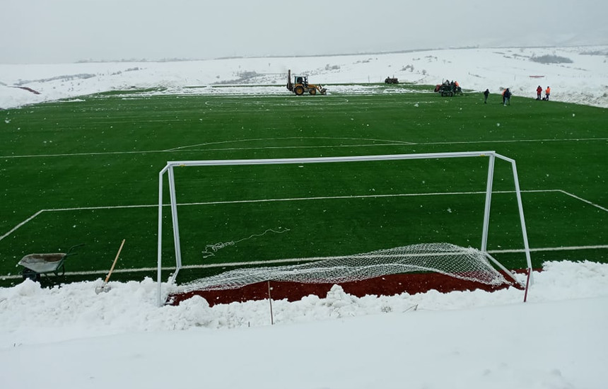Dhjetëra punëtorë po e hiqnin borën nga fusha e Qendrës Nacionale të FFK-së në Hajvali për ta bërë gati për stërvitjen e parë të përfaqësueses së Kosovës në futboll. Disa me lopata e disa të tjerë me mjete motorike që nga mëngjesi i së hënës e deri rreth orës 16:00 punuan për ta pastruar fushën.