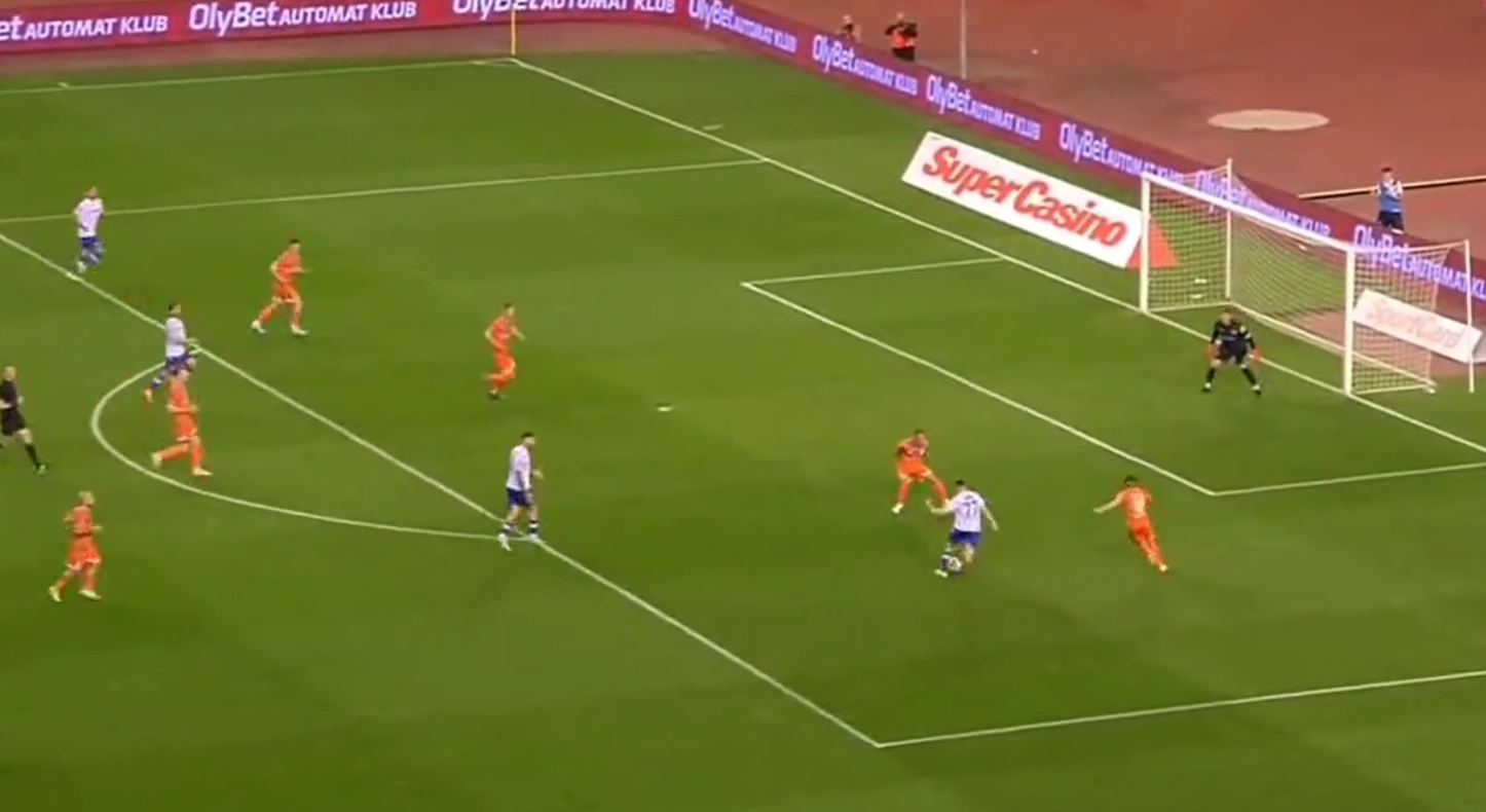 Futbollisti i Kosovës në minutën e 65-të me Hajdukun e Splitit, ka shmangur një futbollist dhe me të jashtmen e ka dërguar topin në rrjetë.