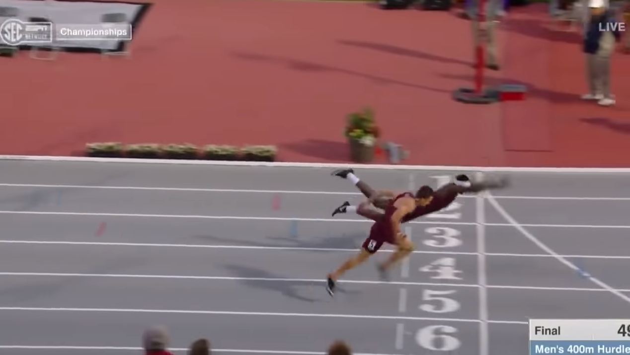 Atleti i Universitetit të Teksasit, Infinite Tucker, po garonte në garën 400 metra me pengesa dhe në fund të garës kërceu për të kaluar i pari vijën e binishit dhe për të dalë i pari në podium.
