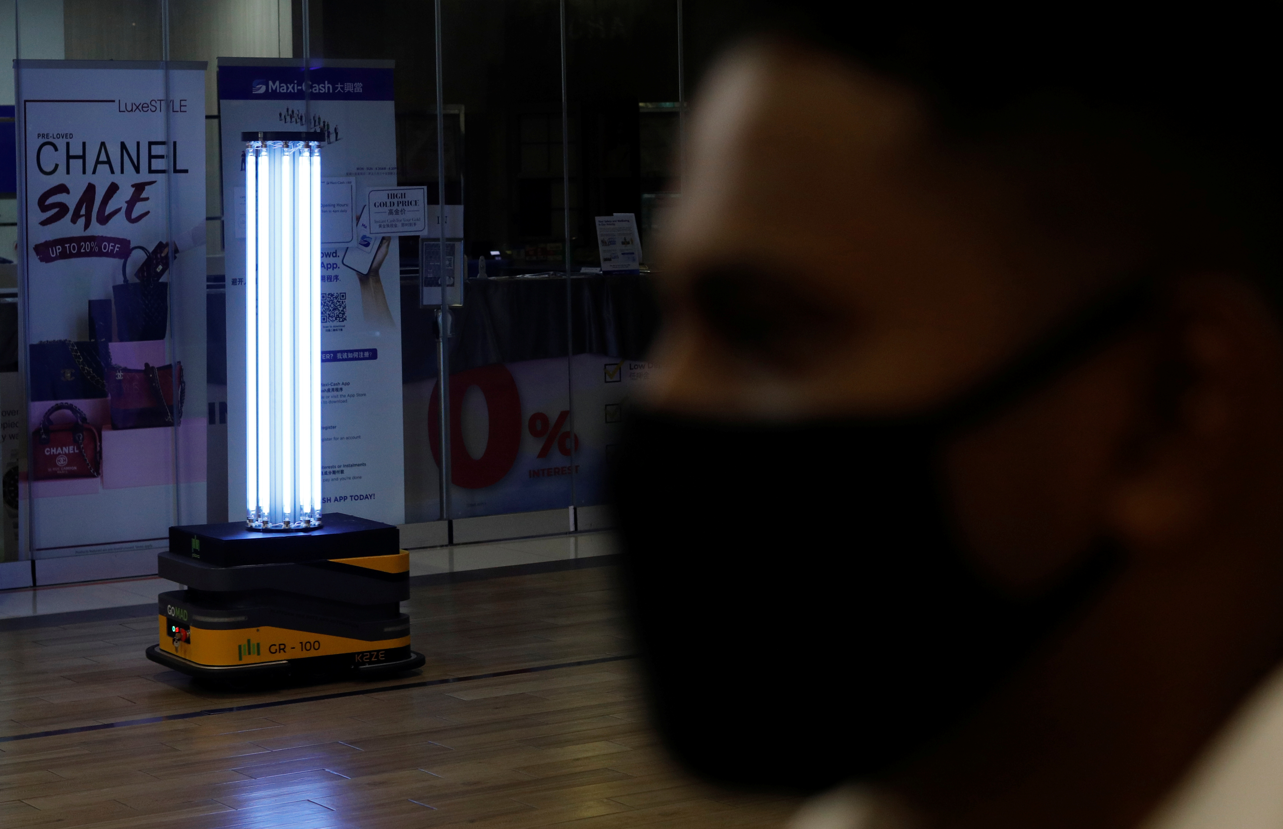 Rrezet ultravjollcë mund të jenë të dëmshme për lëkurën dhe sytë, që është arsyeja pse roboti, që duket si një grumbull i dritave fluoreshente që po lëvizin në dysheme, po testohet nga Fraser Property Retail, gjatë kohës së mbylljes së qendrës tregtare.