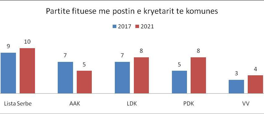 Pas Listës Serbe, PDK dhe LDK kanë fituar postin e kryetarit në numrin më të madh të komunave, apo gjithsej nga tetë. Pas tyre renditen AAK me pesë dhe Vetëvendosje me katër. Nëse krahasohet me rezultatin e zgjedhjeve të vitit 2017, PDK ka shtuar numrin më të madh të komunave të fituara.