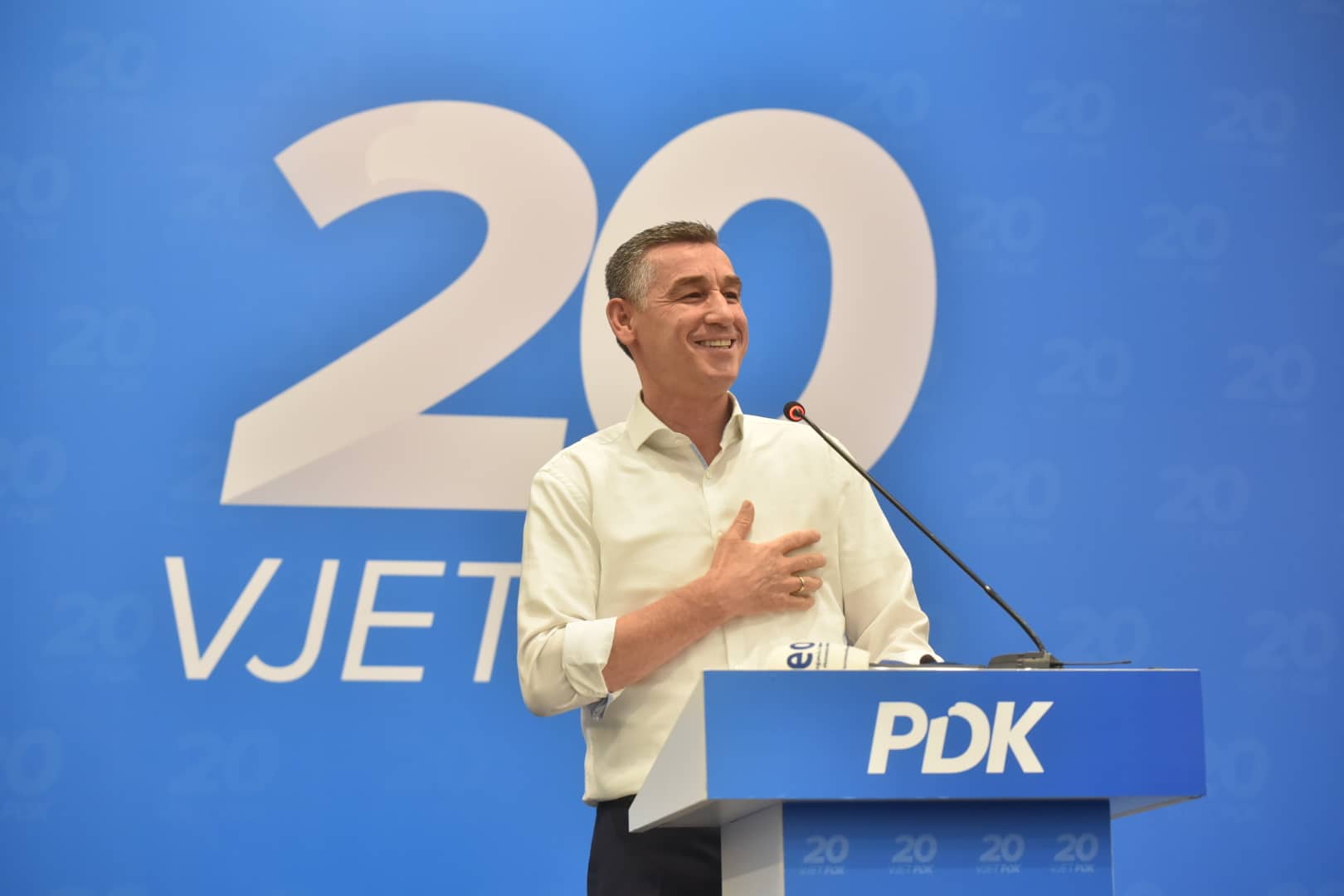 “Para 20 vjetësh, shume idealistë të lirisë, të prirë nga luftëtarë dhe intelektual të ardhur nga betejat e lavdishme, të cilëve ju bashkuan edhe shumë veprimtarë të sinqertë, nisën një tjetër projekt të madh për Kosovën – të cilin, më pas, historia do ta njohë si arritje të jashtëzakonshme. Sfidat e lirisë nuk ishin të lehta për Kosovën. Sot, 20 vjet më pas, e themi me krenari se Partia Demokratike, trashëgimtarja e Ushtrisë Çlirimtare të Kosovës, u soll denjësisht, transformoi veten dhe Kosovën”, tha ai.