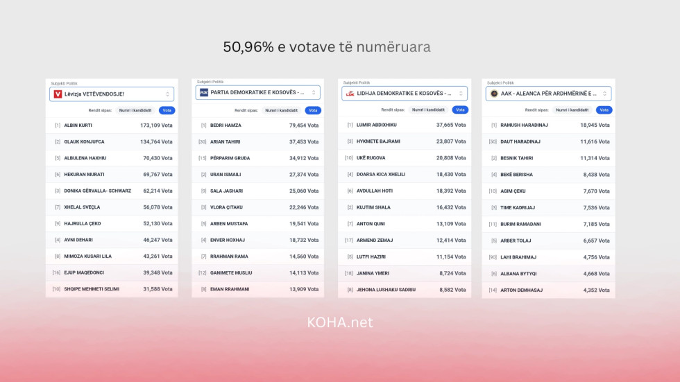Ndërsa dhjetë kandidatët më të votuar janë Albin Kurti (LVV) me 172.610 vota, Glauk Konjufca (LVV) me 134.395, Bedri Hamza (PDK) me 79 mijë e 207 vota, Albulena Haxhiu (LVV) me 70 mijë e 222 vota, Hekuran Murati (LVV) me 69 mijë e 572 vota, Donika Gërvalla-Schwarz (LVV) me 62 mijë e 013 vota, Xhelal Sveçla (LVV) me 55 mijë e 931 vota, Hajrulla Çeku (LVV) me 51 mijë e 970 vota, Avni Dehari (LVV) me 46 mijë e 101 vota dhe Mimoza Kusari-Lila (LVV) me 43 mijë e 73 vota.
