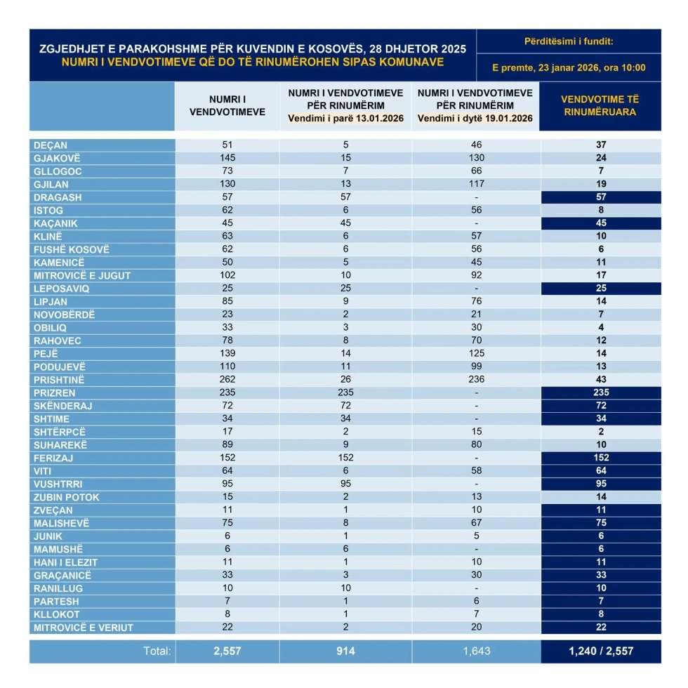 Rinumërimi ka përfunduar në 19 komuna: Dragash, Kaçanik, Leposaviq, Prizren, Skenderaj, Shtime, Ferizaj, Viti, Zveçan, Vushtrri, Junik, Malishevë, Mamushë, Hani i Elezit, Graçanicë, Ranillugw, Partesh, Kllokot dhe Mitrovicë e Veriut.