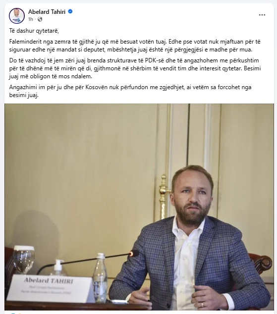 "Faleminderit nga zemra të gjithë ju që më besuat votën tuaj. Edhe pse votat nuk mjaftuan për të siguruar edhe një mandat si deputet, mbështetja juaj është një përgjegjësi e madhe për mua.Do të vazhdoj të jem zëri juaj brenda strukturave të PDK-së dhe të angazhohem me përkushtim për të dhënë më të mirën që di, gjithmonë në shërbim të vendit tim dhe interesit qytetar. Besimi juaj më obligon të mos ndalem", ka thënë Tahiri në rrjetin e tij social Facebook.