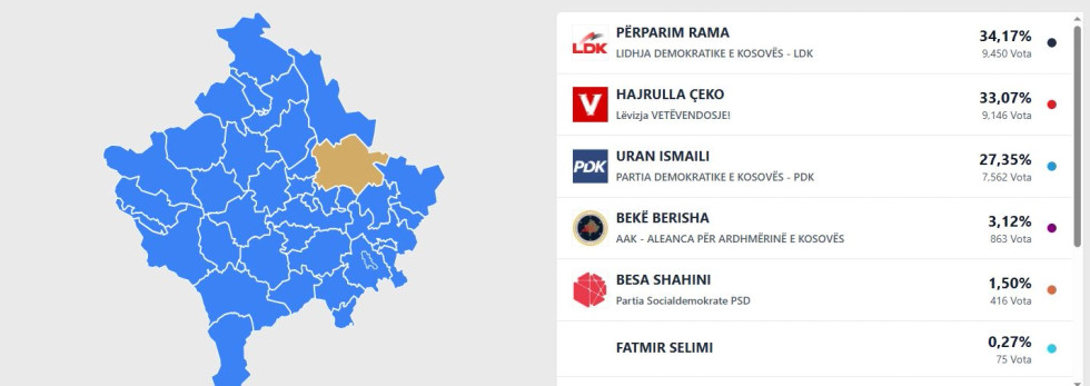 Pas numërimit të më shumë se 22 për qind të votave në Prishtinë, Përparim Rama i Lidhjes Demokratike të Kosovës dhe Hajrulla Çeku i Lëvizjes Vetëvendosjes duket se po shkojnë drejt raundit të dytë.